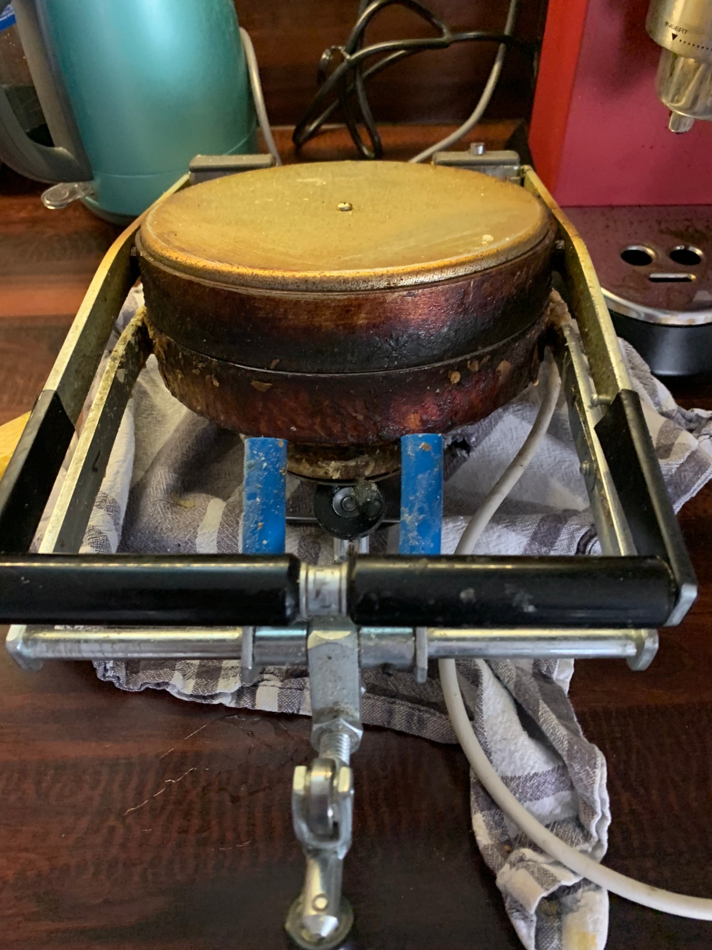 Je to všetko odhadom, pretože by ste z toho mali namiešať takú nie hustú a nie riedku zmes, skoro ako na normálne palacinky. Nechal som to odstáť asi pol dňa normálne na linke a potom ešte poriadne vymiešal. Rozohrial som ten čudný prístroj, že už je mi naznačila svietiaca kontrola. Potrel som tie platne včelím voskom (dodal mi ho k stroju kamoš) a šup na to! No, tá prvá bola poriadna šupa. Nalial som lyžičkou na platňu zmes, zatvoril a hneď som sa aj prežehnal, aby frajerka neprišla domov skôr, ako to stihnem upratať.